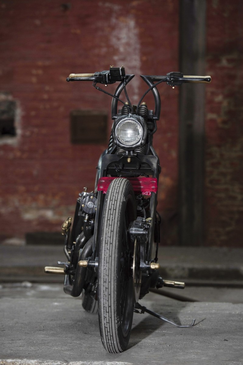 Alle glänzenden Chromteile kamen zum Sandstrahler und wurden „entglanzt“. Mit dem Propangas-Flämmer bearbeitete er die Teile und erzeugte so ein Farbenspiel von Blaugrau (340 Grad), Purpurrot (270 Grad) bis Gelbweiss (200 Grad). Als Abschluss wurde eine Schicht Ovatrol aufgetragen und sorgt so für eine Schutzschicht. Der Rahmen wurde mit „Scotch Brite“ an einigen Stellen bis zur Grundierung angeschliffen und dann wider mit mattem Klarlack überzogen. Die auf Hochglanz polierten Teile des Motors wurden mit Schleifpapier wieder matt geschliffen und teilweise mit schwarzem Motorlack überzogen. Selbst gefertigte Öl und Benzinleitungen fügen sich in das Gesamtbild perfekt ein und gemeinsam mit den Stoffummantelten Kabeln entstand eine klassische Linie. Lederkünstler Nilo wurde mit der Anfertigung des ziemlich schrägen Sitzes beauftragt – das Ergebnis – einfach geil.